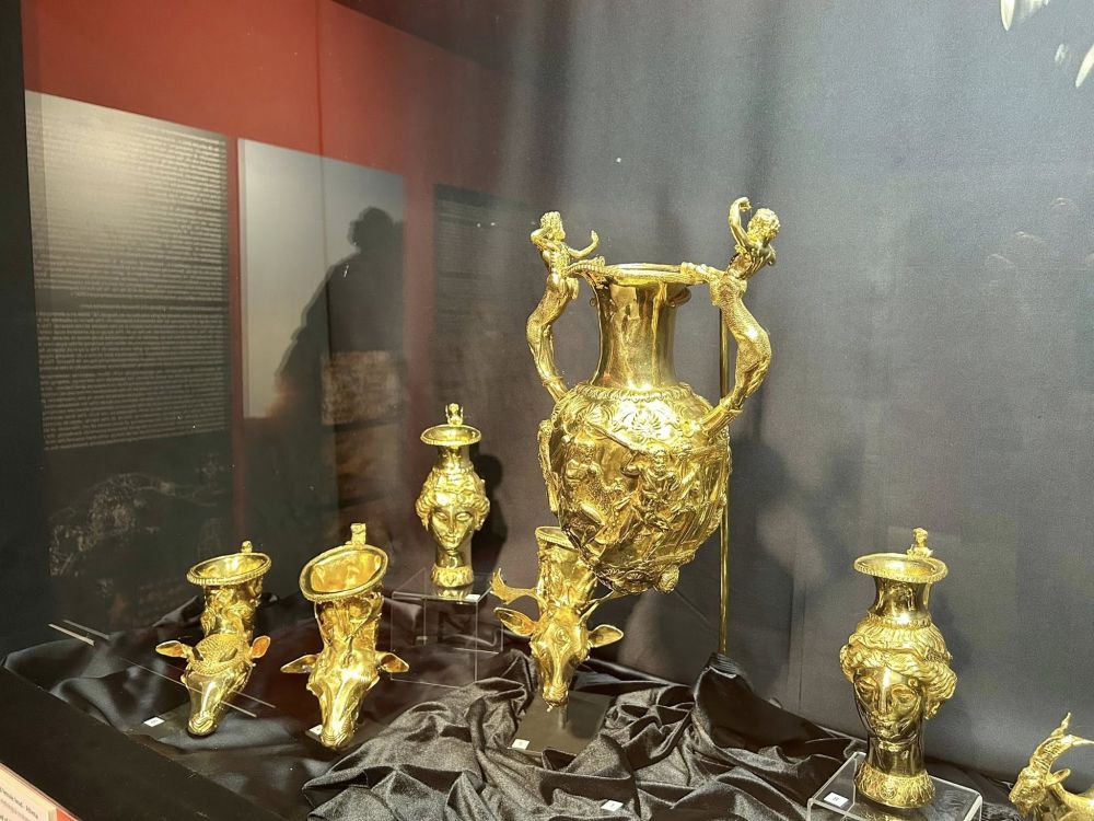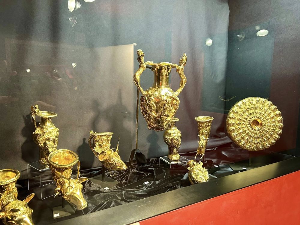 Съдовете са изработени от чисто злато и включват ритони (съдове за вино), амфора и фиала (чаша за възлияния), украсени с изображения на тракийски и гръцки митологични сцени.