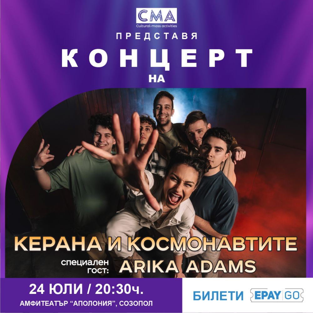 На 24 юли на сцената излизат Керана и космонавтите – една от най-свежите и енергични банди в съвременната българска сцена. Те ще бъдат в компанията на Arika Adams, която ще добави нов колорит към вечерта със своя дълбок и чувствен глас.