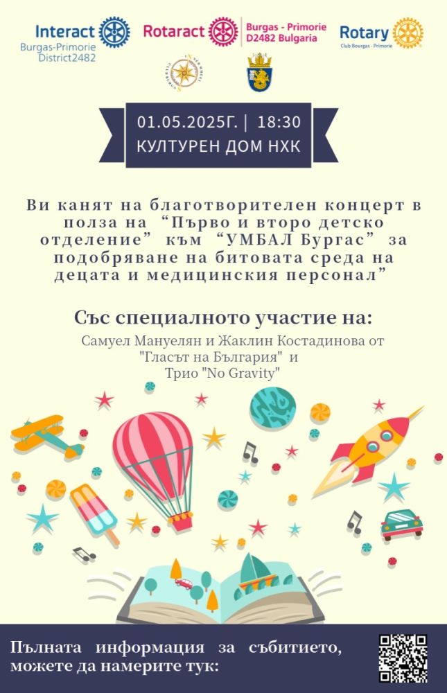 На 1 май от 18.30 ч. в Дома на НХК ще се проведе благотворителен концерт "ЗаЕДНО за бъдещето на нашите деца", с участието на Самуел Мануелян и Жаклин Костадинова от "Гласът на България", трио No Gravity и над 10 бургаски музикални и танцови школи. Организатор е Ротаракт Бургас Приморие и студенти от медицинските специалности на Бургаския държавен университет. Билети се купуват на място, а средствата ще бъдат насочени към подобряване на битовите условия в двете детски отделения на УМБАЛ Бургас.