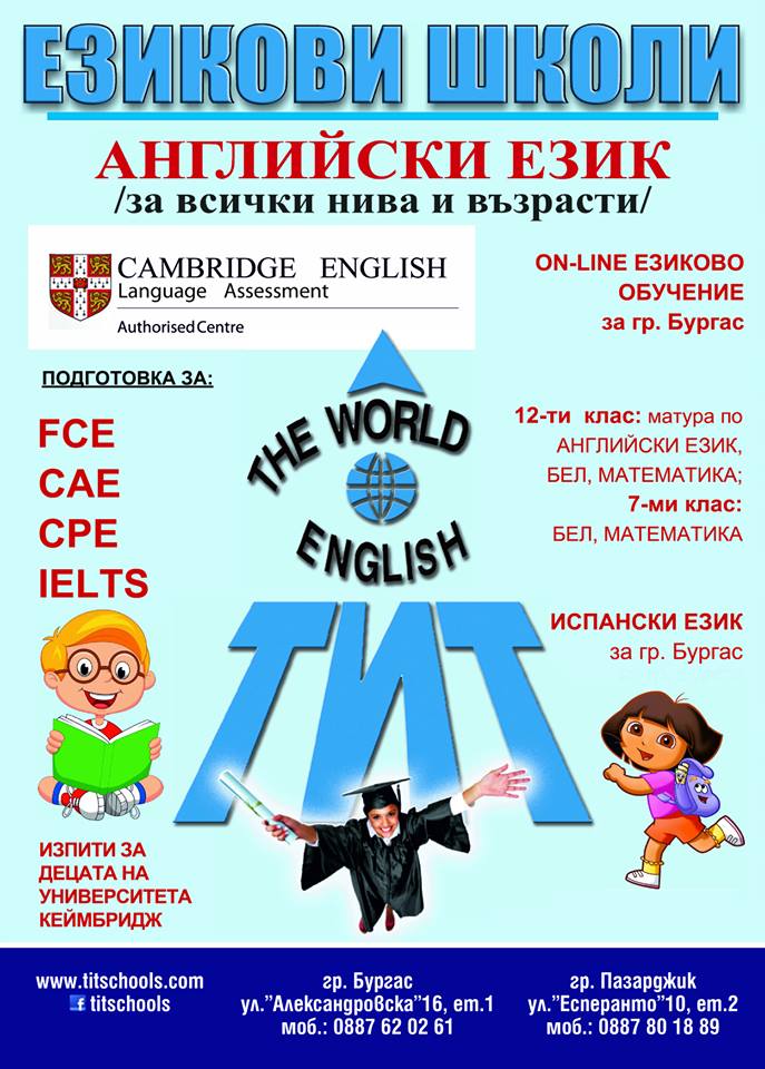 Впечатляващо високите резултати постигнати на изпитите на университета Кеймбридж от учениците на Езикови Школи ТИТ са последица от постоянно тласкащия напред новаторски подход на обучение на целия екип на тази институция в град Бургас и град Пазарджик.