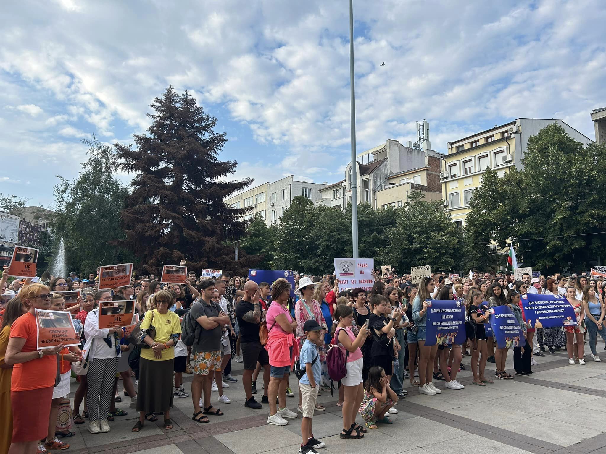 На пл. "Атанас Сиреков" протестиращите скандираха "Не на насилието, ДА на справедливостта. "Когато сме единни, няма проблем, с който да не се справим", бяха категорични хората.