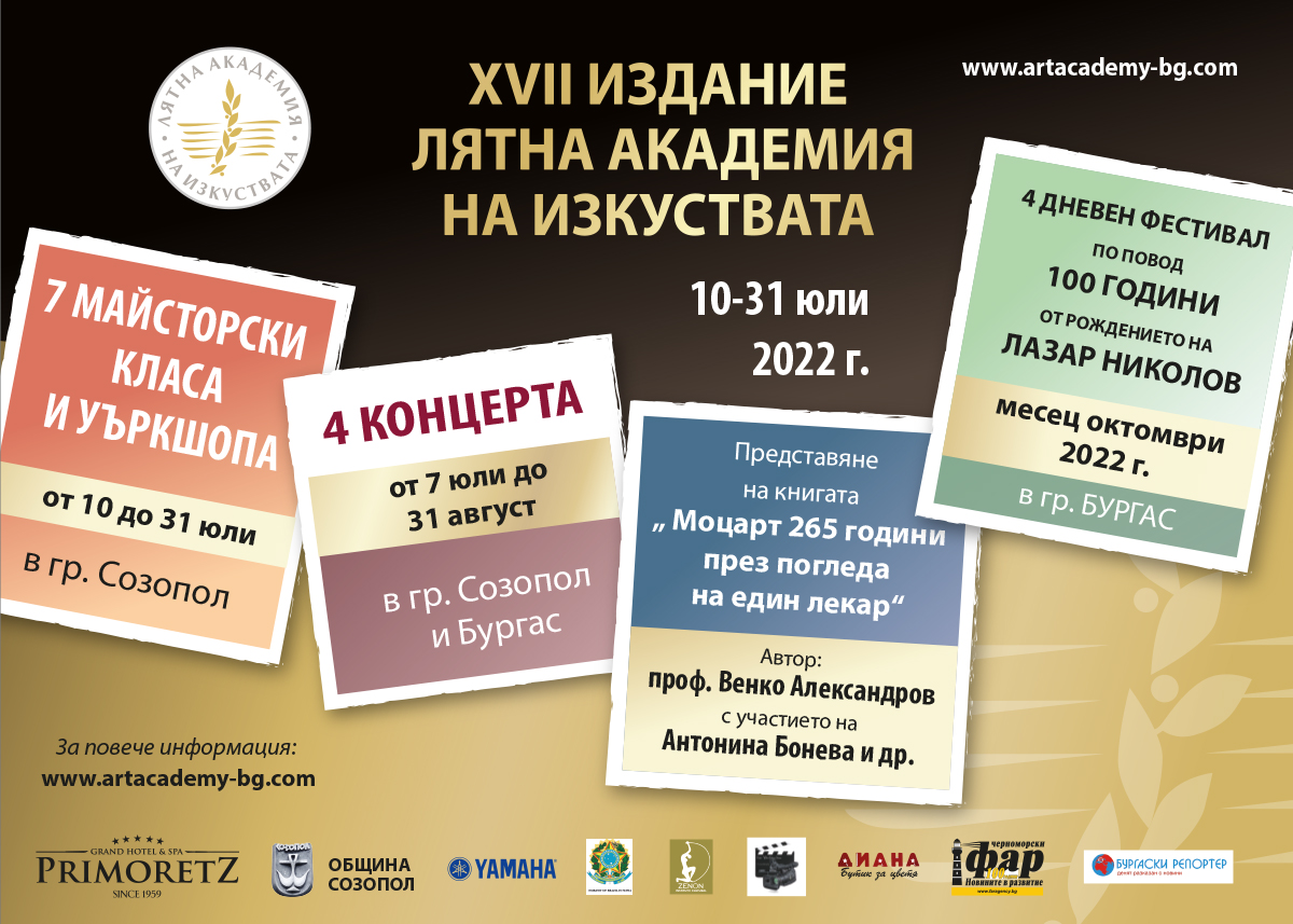 За седемнадесети пореден път Лятна Академия на изкуствата ще събере на едно място световноизвестни имена от сферата на музиката, литературата, визуалните изкуства. Събитието ще се проведе от 10 до 31 юли 2022г. Част от инициативите, включени в програмата, ще се състоят в Созопол, а други ще намерят сцена в Бургас.