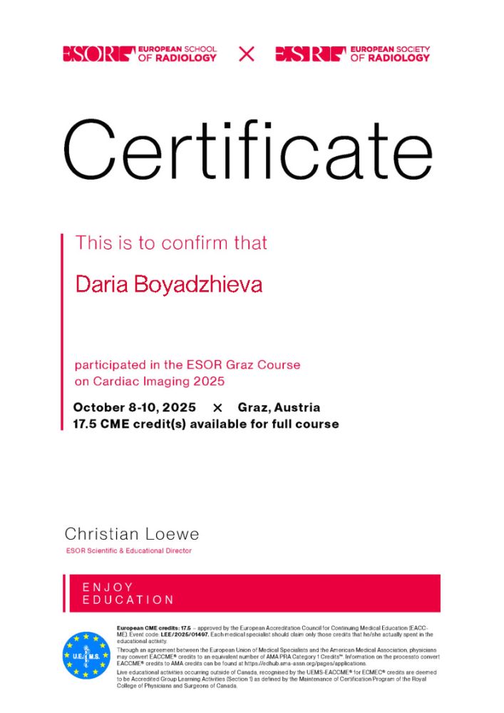 Д-р Дария Бояджиева успешно премина курс „Graztutorial: Cardiacimaging”, организиран от Европейското училище по образна диагностика /ESOR/ в партньорство с Медицинския университет в Грац. Обучението бе насочено към специализанти последна година или наскоро сертифицирани рентгенолози, които искат да повишат квалификацията си в областта на образната диагностика на сърцето.