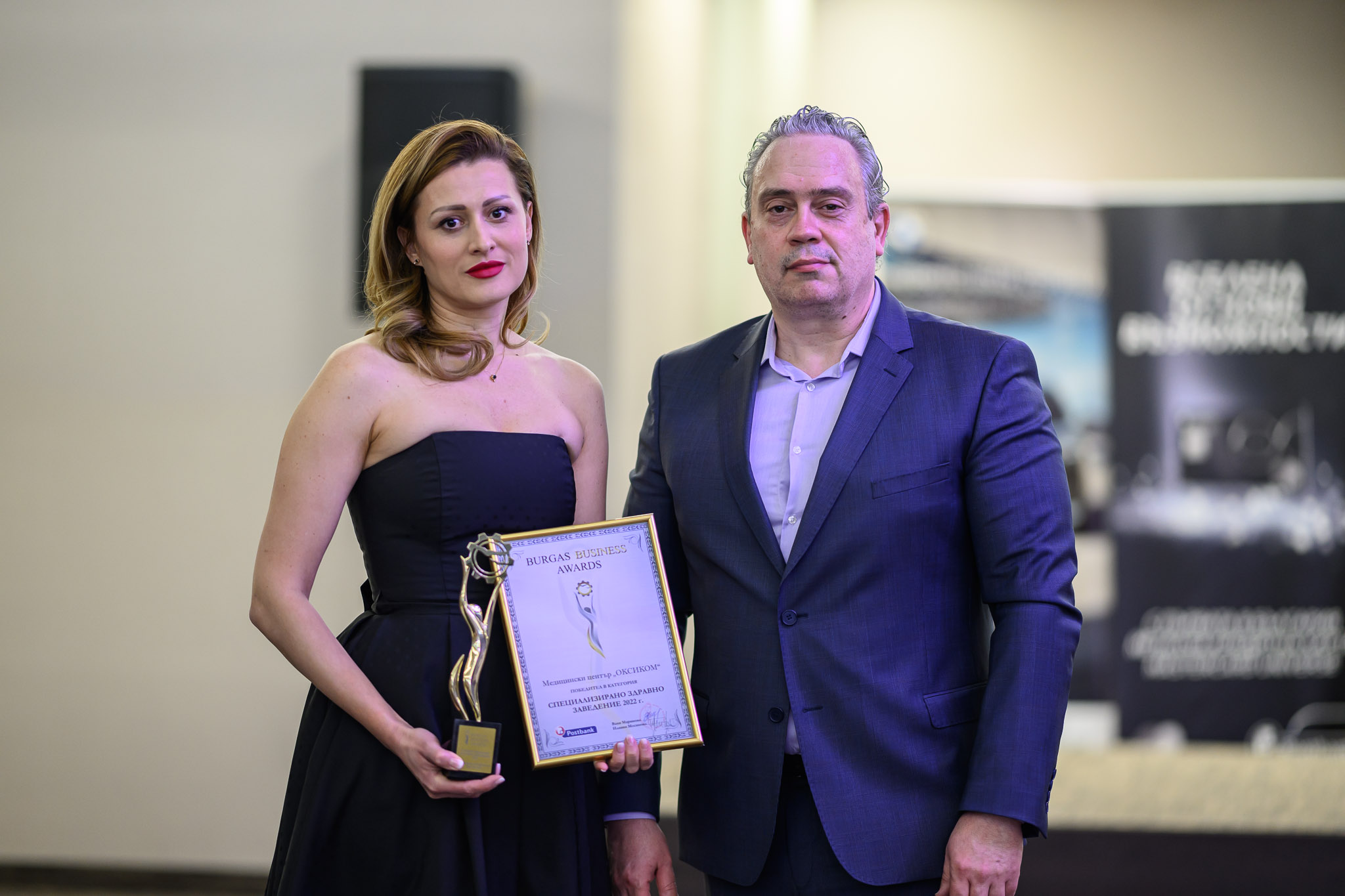 СПЕЦИАЛИЗИРАНО ЗДРАВНО ЗАВЕДЕНИЕ 2022 – Медицински ц-р Оксиком, статуетката им бе връчена от доц. д-р Владимир Корновски - началник на отделението по Кардиохирургия към „Сърце и Мозък“ гр. Бургас;