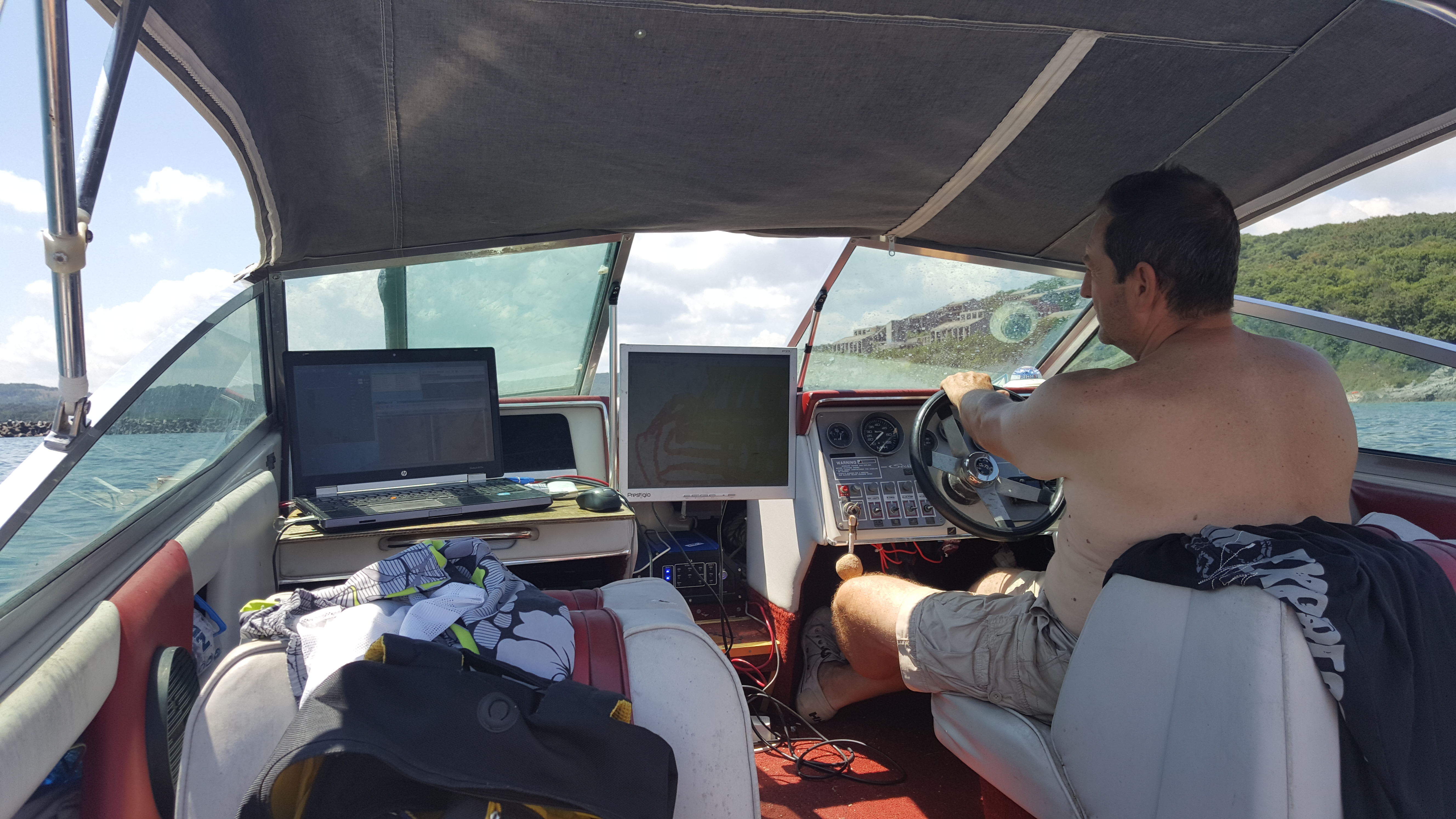 Следващата стъпка в проучванията е свързана с дейността на екипана инж. Велковски, който провежда морско археологическо проучване с използване на комплекс геофизични недеструктивни методи в акваторията на остров Св. Тома. Специално пригодена лодка на Центъра за подводна археология,изпратена от неговия директор д-р Калин Димитров навлиза в по-дълбоките участъци около острова. Лодката е оборудвана със скъпоструваща апаратура, която вижда всичко под водата. Управлението и е поверено наопитния капитан и водолаз Радостин Пенев, който преди да започне работа в Центъра за подводна археолия има дългодишен стаж под вода в Скандинавия.