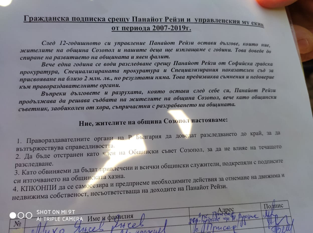 Протестиращите, водени от Тодор Вълчев, съобщиха, че са направили и подписка, в която има вече 400 гласа за отстраняването на Рейзи и Красимира Германова като общински съветници. По думите им те искат прокуратурата да действа по-бързо, тъй като парите в общината ги няма и тя на практика е фалирала. Настояват за ревизия и искат има наказани и хора в затвора. „Къде са парите Рейзи” скандираха протестиращите и разказваха за фритюрници, хладилници и дивани, които били купени с държавни пари на многократно завишени цени.