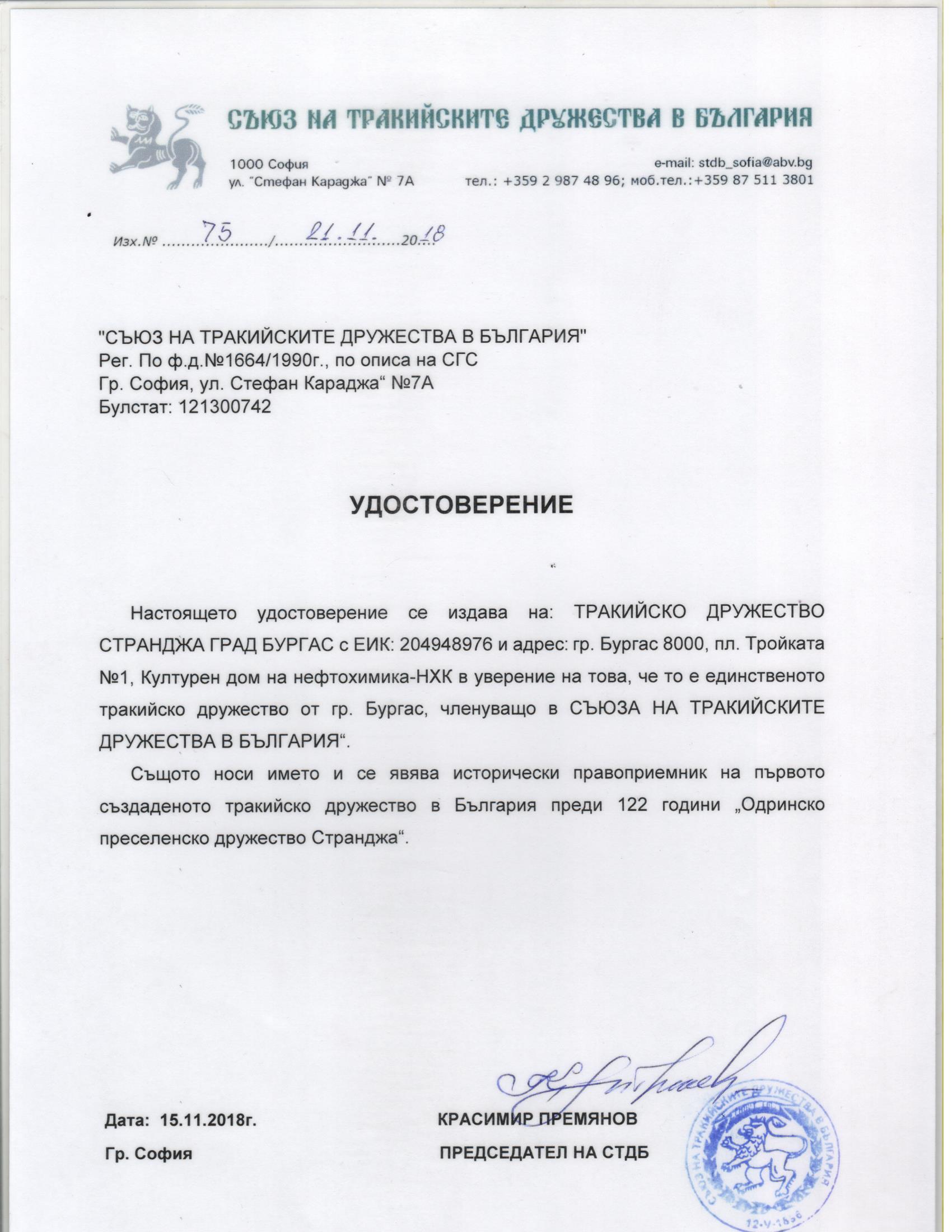 - Тази година ще премине под знака на честването на 125-ата годишнина от началото на организирано тракийско движение в страната. Съюзът на тракийските дружества в България, член на който е и тракийско дружество „Странджа“ в Бургас, се подготвя за тържествата. Програмата по повод на годишнината се уточнява и съобразява с обстановката, породена от корона вируса.