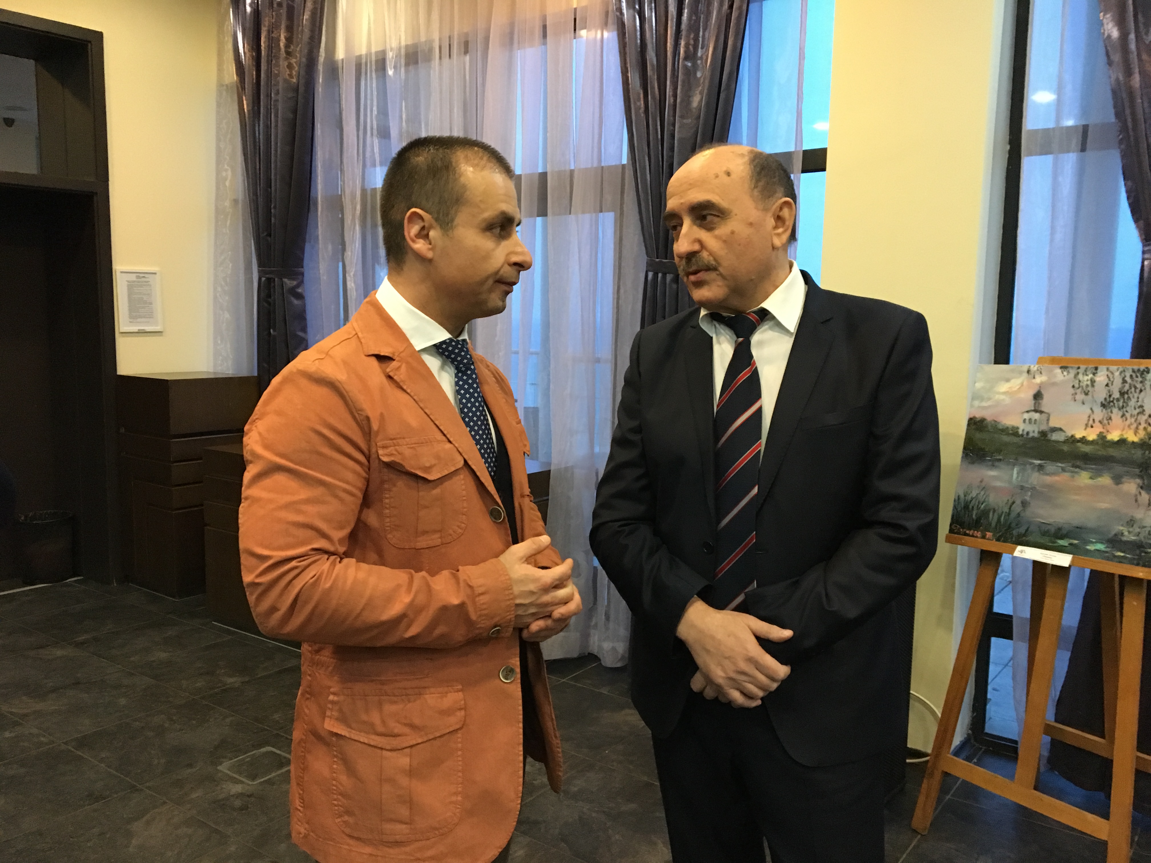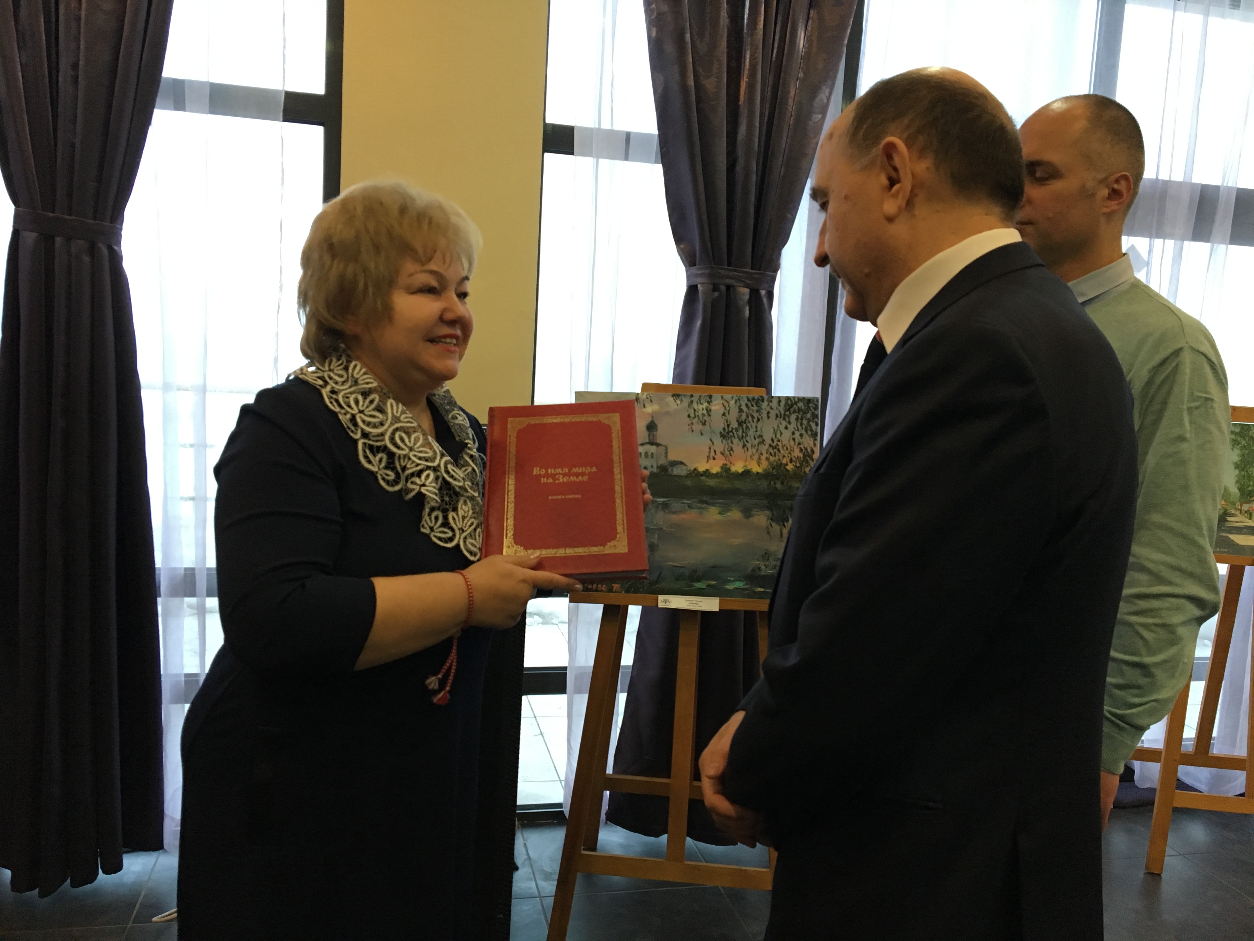 Преди откриването на експозицията Олга Мочалина подари на почетния консул Тонко Фотев албум „В името на мира на земята“. Изданието включва публикации от ежегодния конкурс „Славянски традиции“. В него участват автори на различна възраст от всички точки на земята и регионите на Русия. Г-н Фотев благодари за подаръка, като малко след това подчерта, че България и Русия имат особена дружба, която в годините се е крепила на общата ни писменост и религия. „Тази изложба е едно потвърждение на общото между нас и това, че връзките между двете държави по отношение на култура и изкуство трябва да се развиват“, каза още почетният консул.