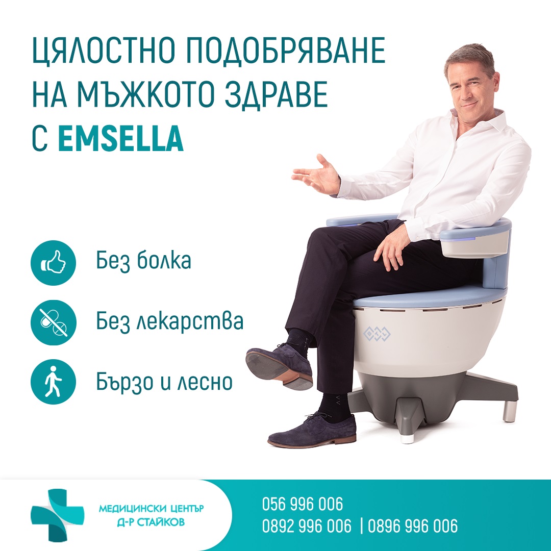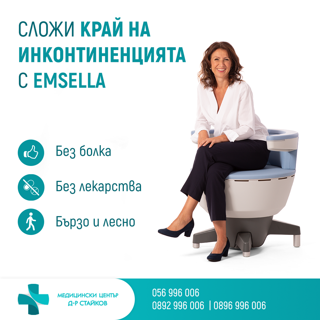Последователни в своя стремеж да подобряват качеството на живот на пациентите, от МЦ „Д-р Стайков“ Бургас отново правят крачка напред в тази посока. Центърът е първото лечебно заведение в града, което предоставя най-модерната терапия за лечение на уринарна инконтиненция с Emsella. Апаратът е напълно неинвазивен (безболезнен). Той е познат и с името „Тронът на Кегел“, заради дизайна и естеството на работата, която върши. За разлика от оперативното и лазерното лечение на проблема, процедурите с апарата по никакъв начин не нарушават нормалния ритъм на живот.